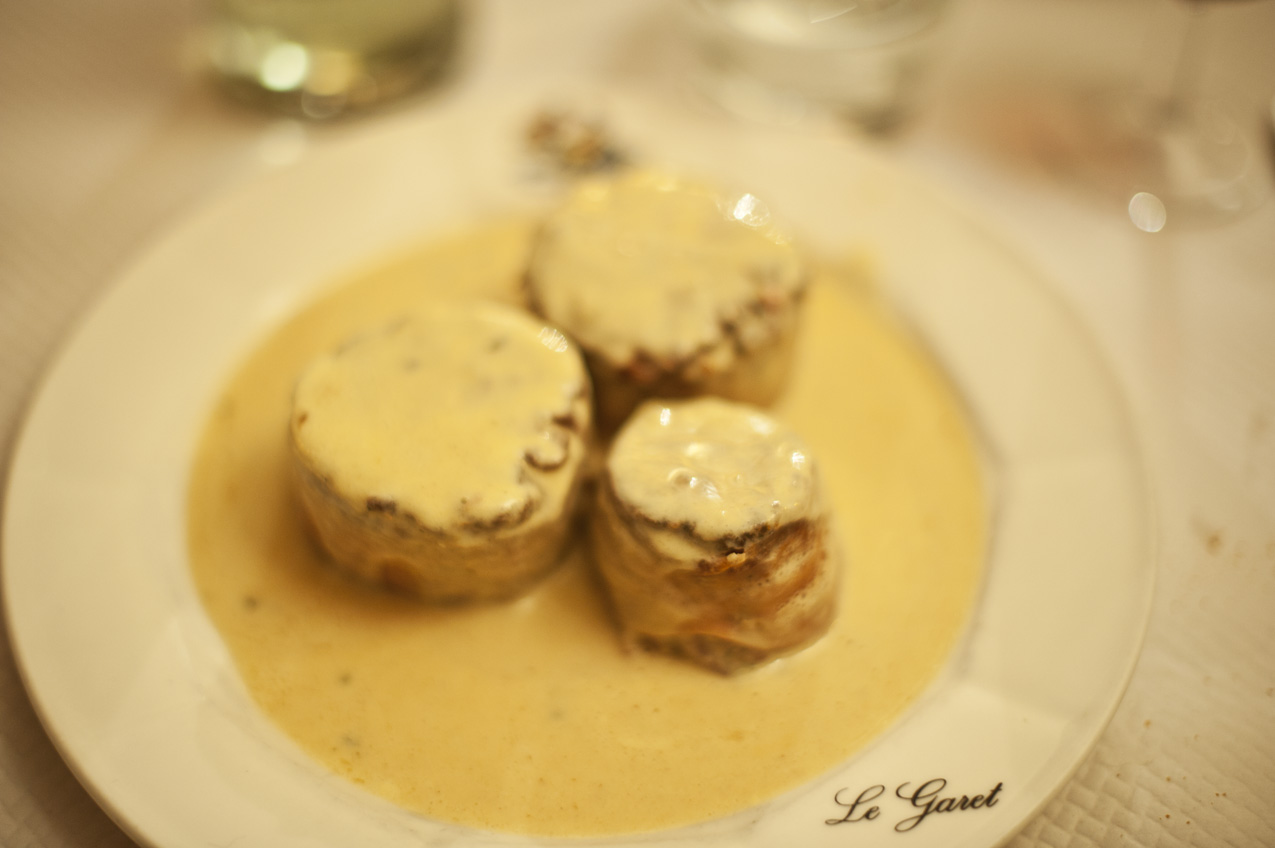 We had heard great things about the bouchon that we picked for dinner, le Garet, and we were excited for a traditional Lyonnaise meal. Elizabeth looks a little worried about the food coming her way, though.