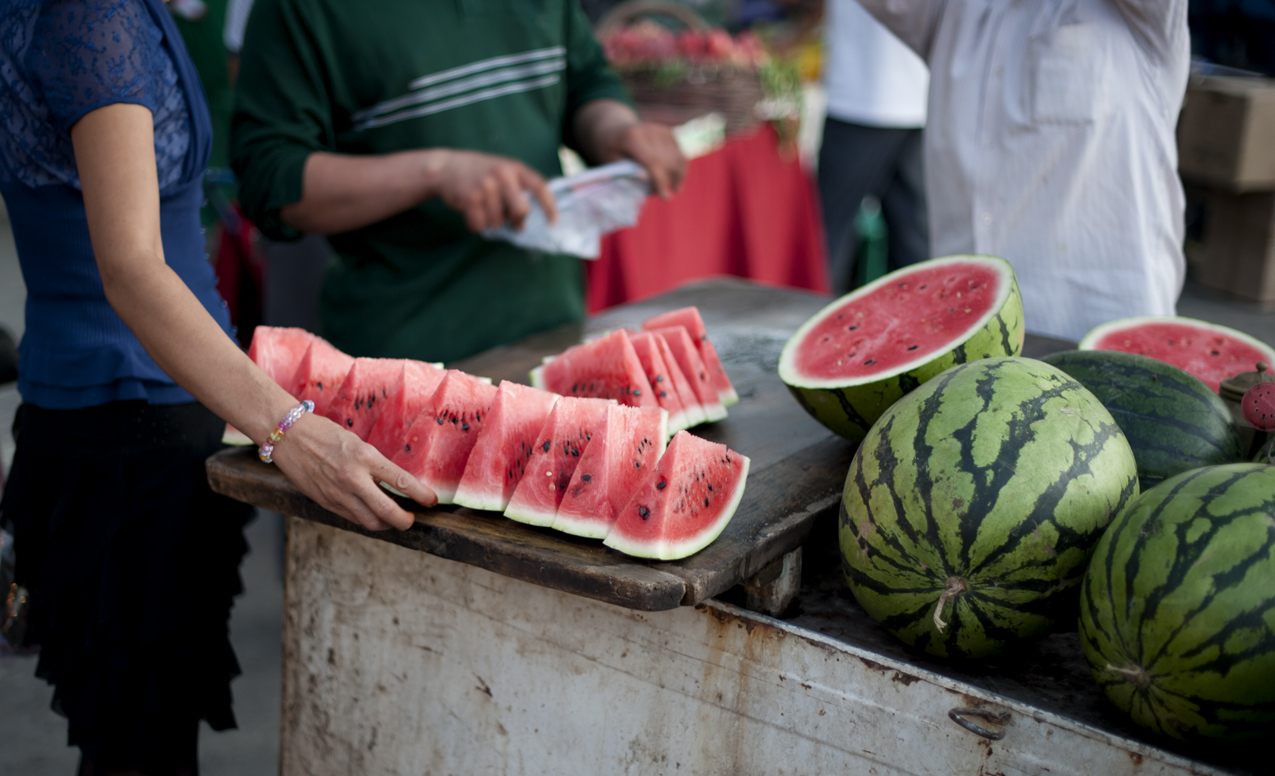 The infamous goat's head stew. I took the plunge, and I would not recommend that you do the same. For 6 RMB, the proprietor of this stand gave me a quarter of a goat's head, with all it's associated anatomy, and a cup of the soup in which it was cooked. Out of respect for my vegetarian readers, I'll leave out the details, but let me say that the taste was fine, but as the cliche goes, it was a textural thing. The piece de resistance, the great delicacy that I won't name, was particularly troubling, and I'm a little shocked that I was able to keep everything down without making a scene. I will see more of this dish over the next couple of weeks, but not by choice. After I ate it, I quickly found a kebab stand, and thinking that a nice spicy skewer was the only thing around that would kill the taste in my mouth, I quickly bought one. It turned out to be all organ meat, a few different kinds, and was the last thing that I needed or wanted. Troubled, I found the closest watermelon stand, and quickly downed two slices.