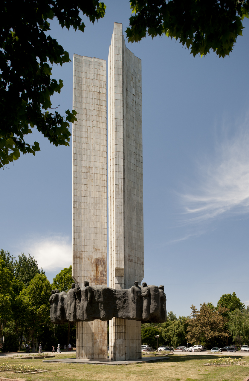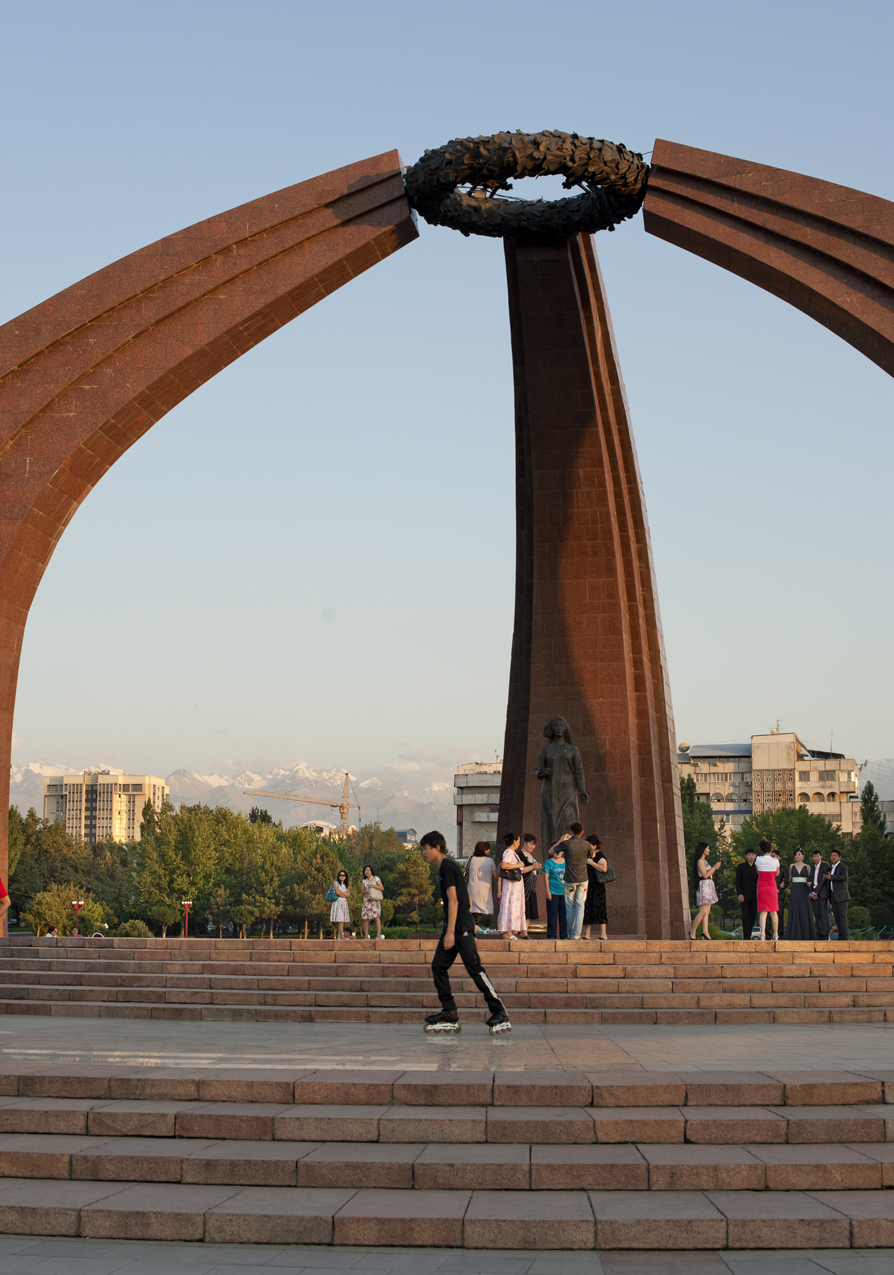 This monument, and abstracted yurt commemorating victory in World War II, with an eternal flame, becomes both a great place to take wedding pictures, and a skate park.