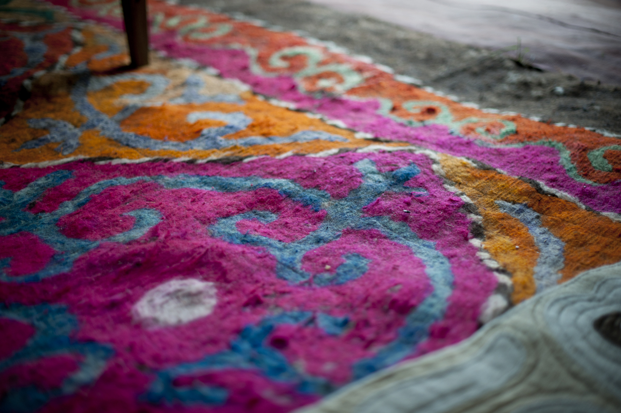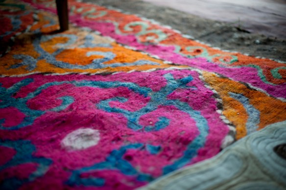 My host father for the evening was busy making a shyrdak when I returned. Shyrdaks are felt rugs that serve as the floors in yurts, and they are still hand made in this region. He has laid out the design in dry died wool, and wrapped it tightly in a reed mat before soaking it in boiling water. He was stomping on the mat to set the pattern, and remove any excess water.