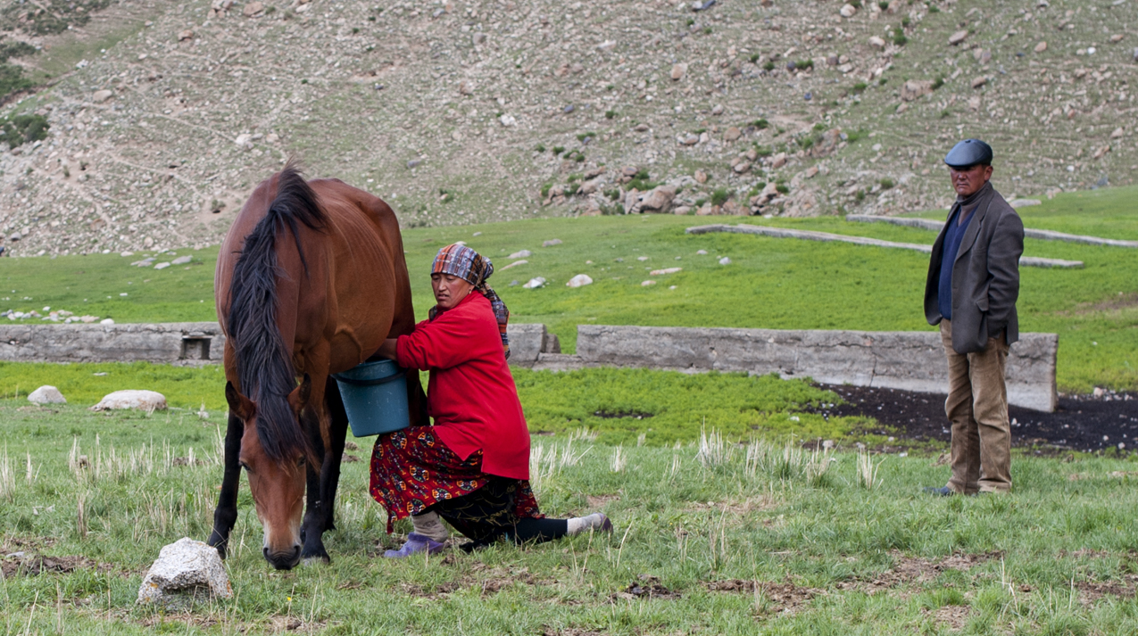 This was the host mother in the yurt on the jailoo (summer pasture) where I spent last night. Here she is milking a horse, which evidently takes a tremendous amount of skill. I didn't even know that people milked horses, let alone drank the stuff.