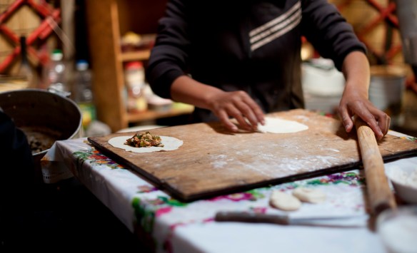 During a rain shower, I went into the yurt, and got to see the mother and her two daughters preparing dinner. They're making some dumplings here.