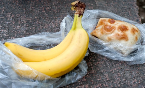 After that whole trip to the bazaar, this is the lunch with which I walked out of there. Bananas are the easiest fruit for me to eat here because they require no cleaning. These pockets are sort of a mixed bag, but everyone seems to eat them here. I never actually know what I'm going to get inside. This one had meat and onions.