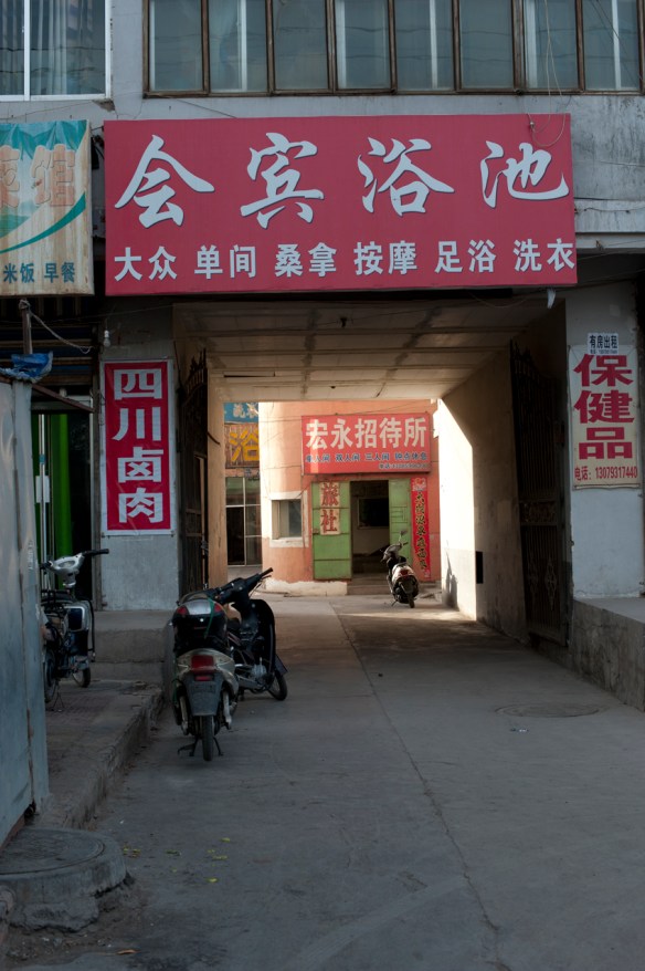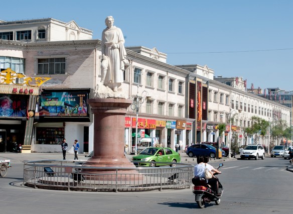 Today, I said goodbye to Zhangye, and traveled by train to Jiayuguan.  Before I left, however, I took a walk around the city, and found whole different worlds on the interior of the large blocks.  Buried behind the modern buildings facing the street, were traditional neighborhoods that had been around for centuries, and were still occupied in the same way.  I also came across a sculpture commemorating Marco Polo’s visit to Zhangye.  I’m basically following his route in reverse, but this was the first time that he and I met eye to eye.  The cheese factor was incredibly high.  Also, it’s been argued recently that he never even made it to China, but just wrote his diary based on other the stories he had heard from other travelers, so I guess I have one up on him there.