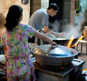 My next stop was the Muslim Quarter, which is just north of the Drum Tower. It consists of a network of narrow streets, lined with shops and restaurants that spill out onto the pavement. The orientation of restaurants is the exact opposite of typical American or European restaurants. Rather than stuffing the kitchens in the back, they are put on display in the front of the restaurant, or right on the street. All cooking is done in plain view, often on open fires or charcoal stoves. The food itself, cooking away, and releasing its incredible aromas, becomes the best advertisement for each restaurant. I didn’t linger for a snack, though, because my plan was to visit the Great Mosque, and come back to the quarter the next day.